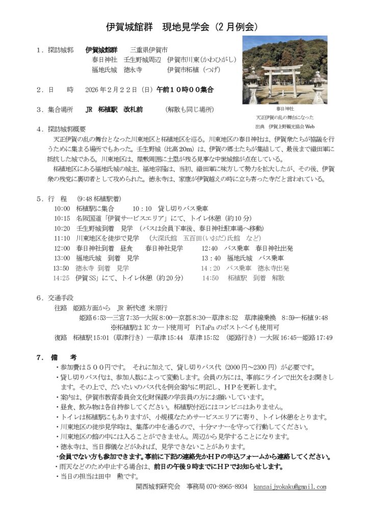 伊賀城館群(伊賀市 川東・柘植地区)現地見学会 2月22日(日) 2026 1/03 2026年01月03日 伊賀城館群 現地見学会ダウンロード 壬生野城跡 | 観光スポット | 観光三重(かんこうみえ) 春日神社 | 観光スポット | 観光三重(かんこうみえ) 福地城跡 | 観光スポット | 観光三重(かんこうみえ) 徳永寺 | 観光スポット | 観光三重(かんこうみえ) お知らせ 10月の例会の日を変更します